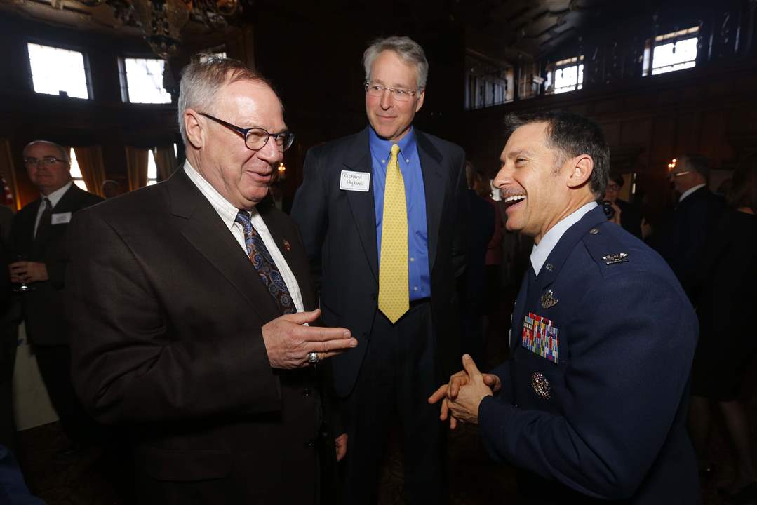 Mayor D. Michael Collins, left, and Richard Hylant speak with Colonel Craig R. Baker, new Commander of the 180th Fighter Wing, during a reception for him at the Toledo Club.