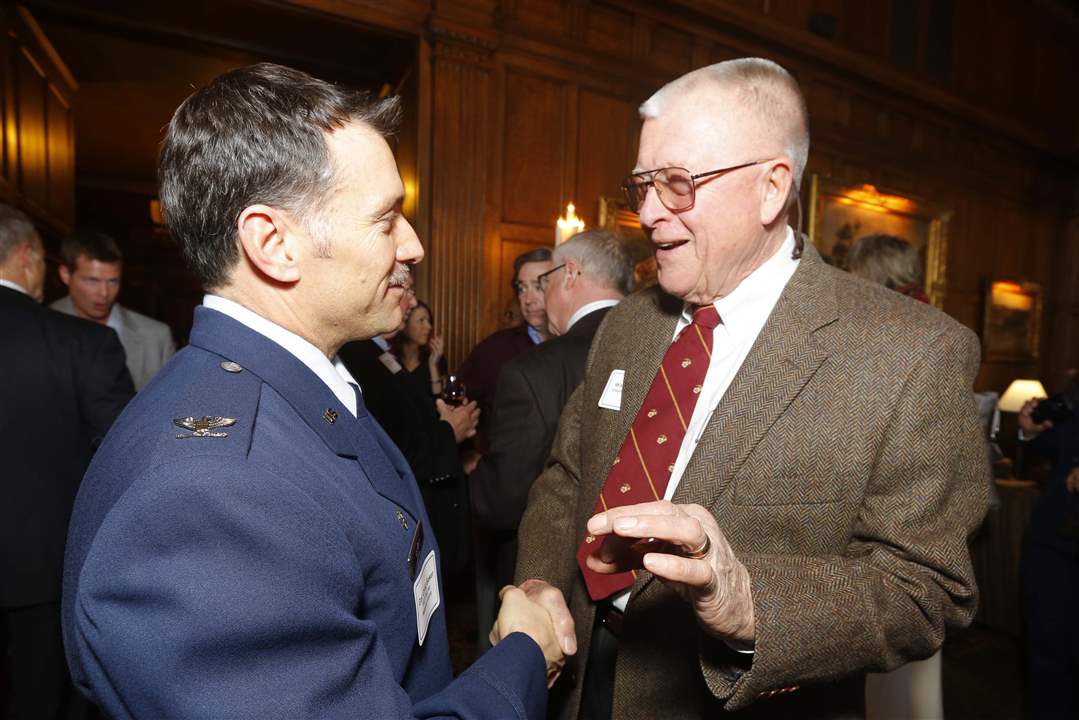 Colonel Craig R. Baker, new Commander of the 180th Fighter Wing, speaks with Walt Churchill during a reception for Col. Baker at the Toledo Club.