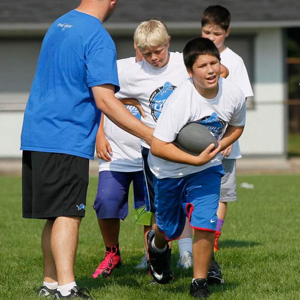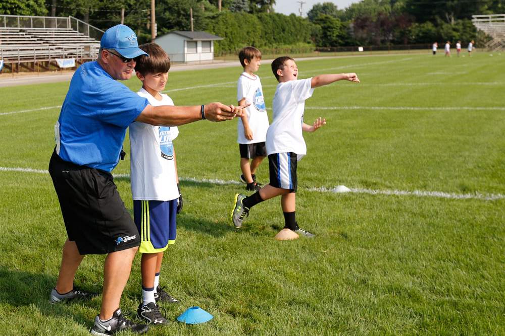 Camp director and coach Jim Hamilton works with Kaden H. on passing the football.