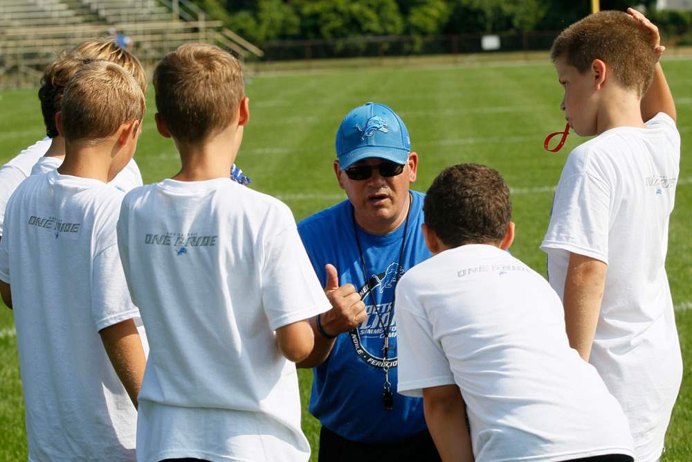 Camp director and coach Jim Hamilton talks with a group about the importance of leadership skills in a quarterback.
