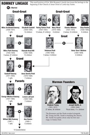 But go back in time past his parents, former Michigan Gov. George Wilcken Romney (1907-95) and Lenora LaFount Romney (1908-98) and their seven children, and some guessing is necessary. A major complicating factor is marriage, or more specifically plural marriage.