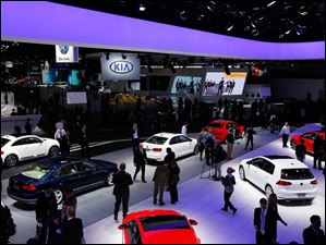 Volkswagens and Kias are on display at the North American International Auto Show in Detroit.