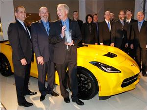Corvette chief engineer Tadge Juechter, third from left, jokes as he poses with his team after accepting the award for North American Car of the Year at the North American International Auto Show in Detroit.