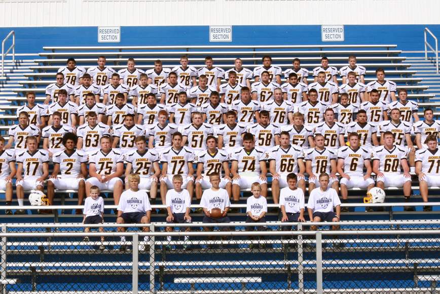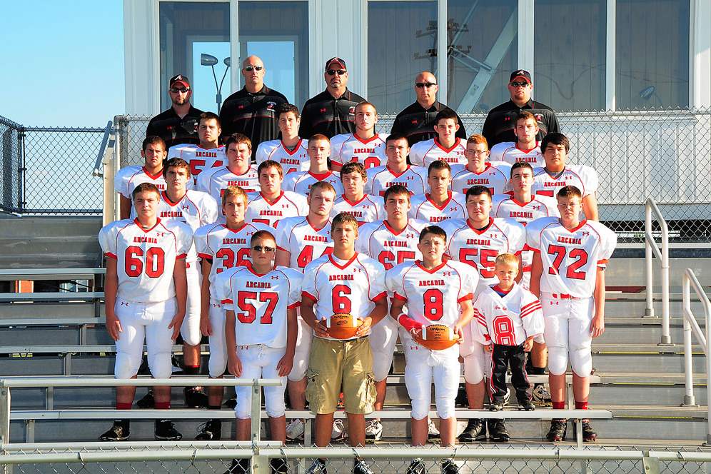 Arcadia high school football team photo, 2014 FROM LEFT Row 1: R Grine, C Cramer, T Brubaker, JT Gehrisch Row 2: B George, L Boyd, C Carnicom, J Thompson, A Jones, D Fenimore Row 3: S Kelly, H Ramsey, AJ Lentz, V Sedler, G Enders Row 4: D Conine, AJ Knepper, A Bohn, J Johnson, M Hill, D Sanchez Row 5: E Boes, T Cheeks, C Baker, A Pessell, L Carnicom Row 6: D Spridgeon, S Zimak, P Gehrisch, A Lentz, J Stone