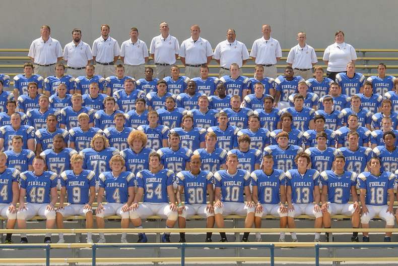2014 Findlay High School football team photo FROM LEFT Row 1: Dakota Feay, Jake Brock, Sam McGhee, Sam Siampaus, Sam Iliff, Doryin Thames, Brandon Muehl, Grant Niswander, Nick Kiffmeyer, Quentin Manns, Dakota Bowser, Tim Van Atta. Row 2: Austin Cameron, Isaiah Settles, Austin Woessner, Marcus Lawson, Alec Bonnoront, Joe Hammond, Blake Burrows, Devin Brown, Chase Hoerig, Anthony Davis, Desmond Lino, Corrina Cowden. Row 3: Alaina Lopez, Tod Beard, Jordan Jones, Connor Price, Grant McKinniss, Chandler Stillings, Luke Cosiano, Nick Berry, Jose Ochoa, Emmanuel Mogolu, Justin Eyerly, Stephen Markley, Joe Misamore, Matthew Bryant. Row 4: Bridget Rettig, Elisha Hensley, JJ Reneau, Noah Routson, Chase Owen, Chris Ricker, Peyton Manns, Dewey Lee, Gage Watson, Elijah Mahone, Devin Zimmerman, Josh Shuck, Zach Harris, Brandon Armstrong, Cassidy Saldana. Row 5: Billy Milliron, Bryce Burrows, Matt Pochard, Austin Rhodes, Wes Van Atta, Sami Salama, Marquis Landers, Javon Stallings, Drew Givens, Tre Miller, Robert Hammond, Avery Wirt, Cameron Crotinger. Row 6: Rick Coleman, Daniel Erlandson, Damien Preteroti, Jeremiah Tate, Zach Hannah, Marlon Collins, Mitchell Hucke, Loren Charles, Peter Strzempka, Aaron Kupferberg, D'on Stinson, Zach Short, Kyle Nunn, Sam Kovaleski. Row 7: Head coach Mark Ritzler, assistant coaches Marc Bosworth, Ryan Brooks, Brad Burrows, Chris Ireland, Cory Echelberry, Todd Armstrong, Matt Best, Brit McClintock, Erin Hemmelgarn.