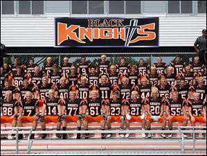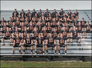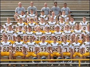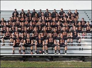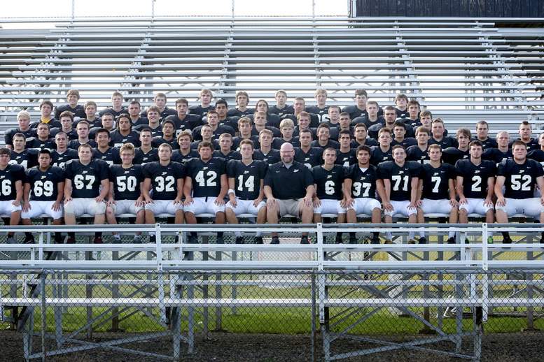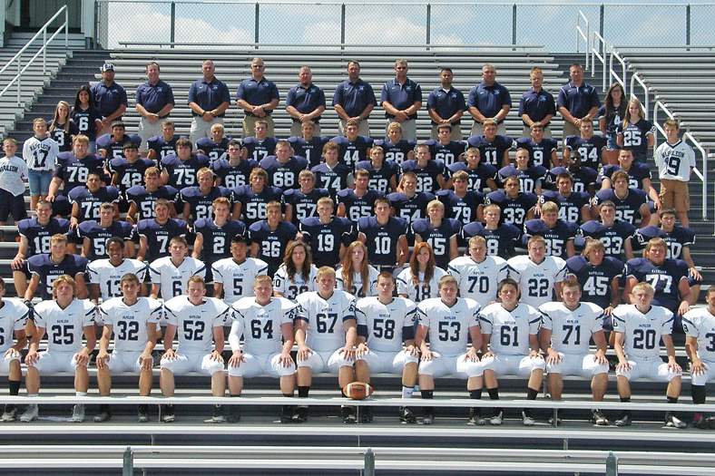 2014 North Baltimore High School football team. FROM LEFT Row 1: T.J. Harshamn, Lane Bishop, Christian Richmond, Jacop Dick, Levi Newcomer, Jacob Pelton, Bryce Lennard, Joe White. Row 2: Rikko Phamakao, Alex Nichols, Sean Watson, Zach Meggitt, Kaleb Andrus, Andrew Hollinger, William Griffith IV, Body Naugle, Hank Matthes. Row 3: Matt Andrus, Jimmy Smith, Noah Brian, Taylor Bishop, Bryce Gunter Row 4: Chase Naugle, Owen Stewart, Chase Cotterman, David Patterson, Noah Cotterman Row 5: head coach Greg Bishop