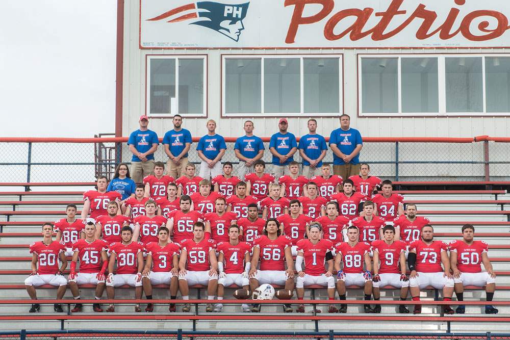 Patrick Henry Football 2014 FROM LEFT Row 1: Chase Shank, Tyler Shope, Harvey Shanks, Kyler Seemann, Blake Rosebrook, Lucas Brown, Caleb Carrizales, Neil Storch, Bryce Bostelman, Jake Ehlers, Drew Maas, Kenny Nickels. Row 2: Brody Cassillas, Brennan Jackson, Sidney Brewer, Brandon Bennett, Brad Pfister, Donnie Johnson, Kent Petersen, Mitch Bonner, Tristan Novak, Doug Tussing. Row 3: Jacob Clemens, Brock Gerken, Jordan Boyer, Joe Tanner, Kal Harris, Alex VanDeBussche, Mason Fintel, Jake Miller, Trey Zimmer. Row 4: Manager Maddie Weirich, Damian Lanzer, Brock Michaelis, Ronnie Andonian, Steve Diem, Hunter Schock, Sean Norden, JJ Rettig. Row 5: Coaches Zach George, Justin Sonnenberg, Jeff Kirkendall, head coach Joe Kirkendall, Ben Schwab, Greg Leonard, Justin Lederer.