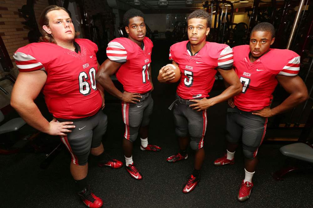 Central Catholic football players from left to right Christian Ward, Jermiah Braswell, Marcus Winters and Stephon Campbell.