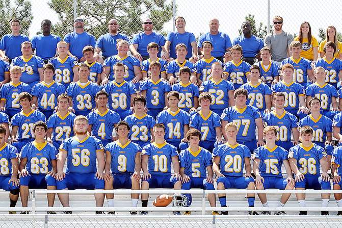 Lakota High School football team 2014. FROM LEFT Row 1: Caleb Steele, DeAndre Cannon, Patrick Shull, Austin James, Jordan Jaso Row 2: Hunter Greiner, Armando Palos, Dakota Gilbert, Andrew Perree, Chris Fillhart, Josh Short, Spencer King Row 3: Paul Mowry, Brenden Biddle, Andrew Hovis, Gabe Boose, Cory Ulmer, Dakota Bowling, James Knallay, Zack Stewart Row 4: Lucas Streacker, Tyler Gabel, Jordan White, Noah Koester, Levi Myers, Darry Endicott, Tyler Wehrle, Antonio Diaz Row 5: Collin Carr, Dayvin Hagemann, Tony Gonyer, Zach Thomas, Logan Stone, Chaunce Gangwer Row 6: Coaches Don Bowling, Nick Petroff, Eric Brickman, Shane Jacoby, D.J. Dyer