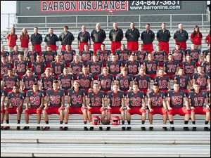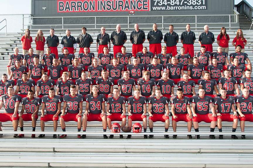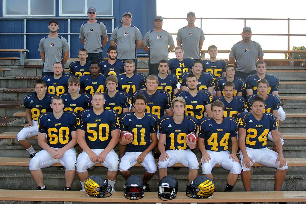 Erie Mason high school football team, 2014. FROM LEFT Row 1: Joey Richardson, Bobby Livernois, Ian Deye, Austin Penn, Austin Laderach, Jordan Mendoza. Row 2: Anthony Espinosa, Bailey Dominique Bailey, Jacob Huber, Noah Steinman, Sean Strickler, Doug Cousino, Collin Cooper. Row 3: Andrew Stuard Andrew, Tyree Young, Gunner Blank, Zach Neely, Dawson Larrow, Reagan Judson, William Axel . Row 4: Mike Richey, Jared Dutra, Kyle Himebauch, Devin Myers. Row 5: Coaches: Blade Bowman, Tyler Bitz, Steve Bowers, head coach Joe Ayers, Derek Bowman Mendoza, Chad Jacklitch.