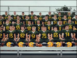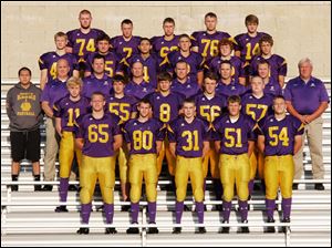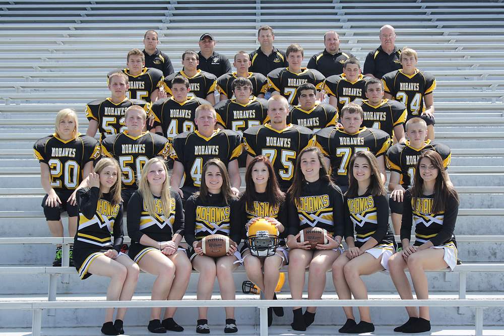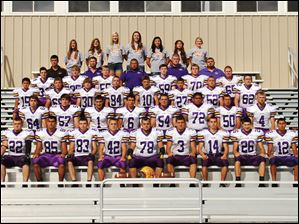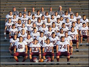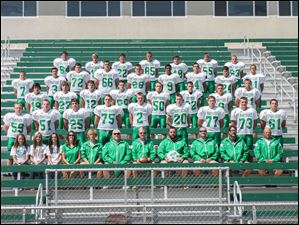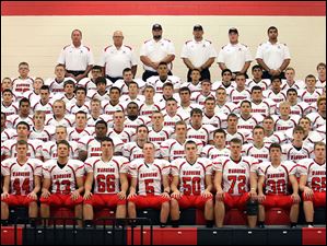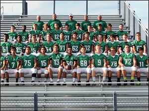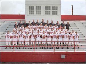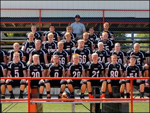 Fostoria St. Wendelin high school football team photo, 2014. FROM LEFT Row 1: Cheerleaders Melissa Finsel, Rebecca Berton, Brenda Gillig, Marissa Kuhlman, Sophie Decker-Pahl, Emma Prince, Riann Reinhart. Row 2: Julia Kerlin, Connor Lammers, Donovan Scudder, Rob Park, Justin Meyers, David Stosio. Row 3: Devin Frankart, Isaiah Cassidy, Luke Volkmer, Logan Colburn, Brayden Moon. Row 4: Ryan Nicholson, Cyle Smith, Spenser Hipsher, Drew Schetter, Brody Whetsel, Justin Walter. Row 5: Coaches Eric Perkins, Shawn Earl, head coach Jim Bodart, Adam Flugga, Jerry Rumschlag.
