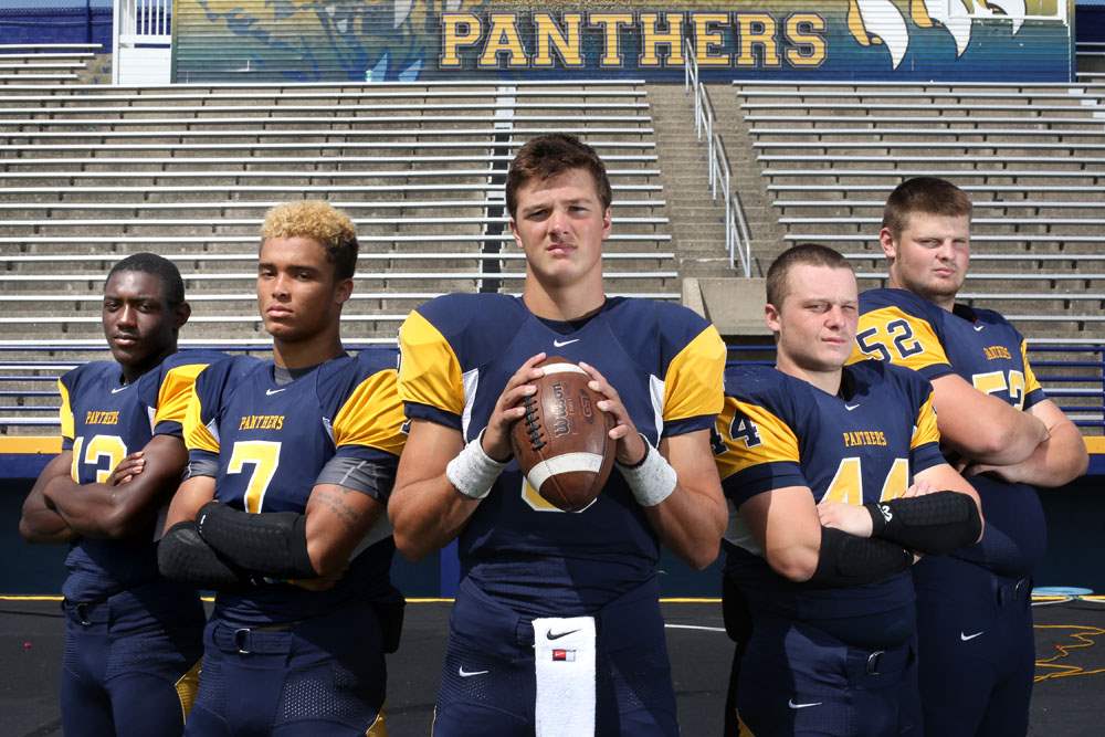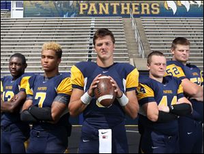 Senior Jamal Bell, left, senior Elijah Elliott, center left, junior Chase Bodeman, center, junior Austyn Melroy, center right, and junior Kobee Houghtlen, right, are planning on leading Whitmer High School's Panthers to victory this season.