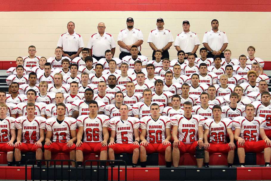 2014 Woodmore High School Football team. FROM LEFT Row 1: Drew Lewandowski, Andy Hernandez, Jeremy Cuevas, Dennis Ratz, Ian Weishuhn, Logan Fonseca, Josh Cowell, Thomas Schnitker, Ross Wolford,John Williams. Row 2: Jared Gears, Chris Klett, Dustin Haar, Parker Lowe, Dillon Williams, Evan Sandwisch, Joseph O' Connor, Ross Weircih, Tyler Mulligan, Connor Bringman, Todd Williams, Colin Sandrock. Row 3: Derek Wank, Connor Haas, J.T. Atkin, Brandon Cowell, Ben Wilt, D.J. Wellons, Joey Morris, Mason Beachler. Row 4: Jeff Cuevas, Wyatt Schling, Carlos Ramirez, Cole Sirmans, Davis Spicer. Row 5: Coaches Bob Kelly, Curtis Schlea, Brian Spicer, Zach Floro, Tom Floro.