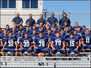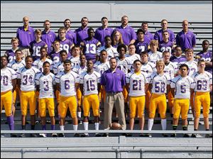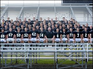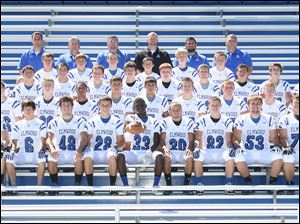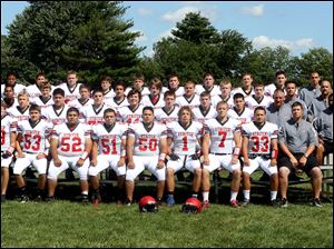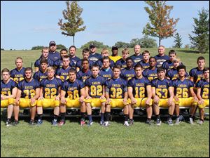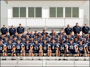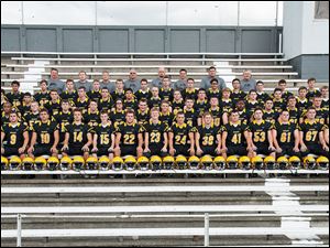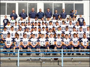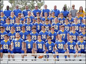 Toledo Christian high school football team photo, 2014. FROM LEFT Row 1: Gabe Bigelow, Caleb Wells, Adam Meiring, Damon St. John, Matthew Brumbaugh, Caleb Wotring, Brett Freeman, Michael Geis, Michael Norman, Luke Wells. Row 2: Garon Beard, Mason Hecklinger, Austin Ritsema, Jeff Lewis, Taylor Weghorst, Tony Fuller, Caleb Johnson, Larry Burkhardt, Chad Newell. Row 3: Graham Leu, Issac Faylor, Issac Urban, Corey Butler, Carson Valigosky, Kyle Brindley , Austin Miller. Row 4: Coaches Mike Geis, Tab Greenlee, Andrew Skeels, head coach Craig Willis, Brett Brumbaugh, Gary Jennings.