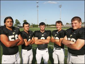 Perrysburg's Chaz Westfall, left, Trevor Hafner, center left, Seth Durham, center, Gus Dimmerling, center right, and Cale Bonner, right.