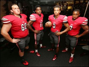 Junior Chris Sudduth, left, and seniors Justus Satterfield, center left, Doniven Clark, center right, and Vince Hill, right, are all returning to Bowsher's lineup this fall.