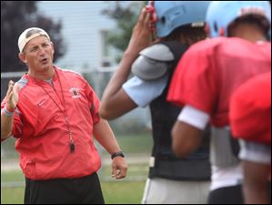 Bowsher coach Craig Lubinski conducts practice at Bowsher High School in South Toledo. The Rebels are gearing up for the season.