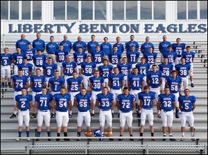 Liberty-Benton HS football team 2014 FROM LEFT Row 1: Chase Conkle, Jake Rozelle, Grant Kinsinger, Justin Iott, Austin Combs, Allan Hartley, Griffin Rath, Mitch Rhodes, BJ Lawson. Row 2: Trevor Springer, Matt Groves, Mason Rose, Jeff Gierke, Cole Smith, Jacob Schimmoeller, Alec Rhodes, Nathan Craft, Matt Loughman. Row 3: James Chandler, Jacob Nichols, John Rozelle, Evan Stump, Kegan Kaedang, Sam Bell, Clay Lenhart, Nick Burner, Andrew Vucco. Row 4: Tyler Dillon, Soloman Garcia, Hunter Haws, Austin May, AJ Dobbins, Mason Greer, James Hearn, Justin Risner, Conor Greer, Griffin Hohman, Connor Johannigam. Row 5: Bobby Musselman, Grant Vermilya. Row 6: Coaches Jeff Lease, Jason Elchert, Jake Warrington, Scott Arnold, Aaron Dietsch, Nate Aydt, Brandon Pickett, Matt Rader, Michael Busch, Scott Garlock, head coach Tim Nichols.
