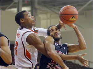 BG's Spencer Parker fights for the rebound with Northern Illinois' Pete Rakocevic.