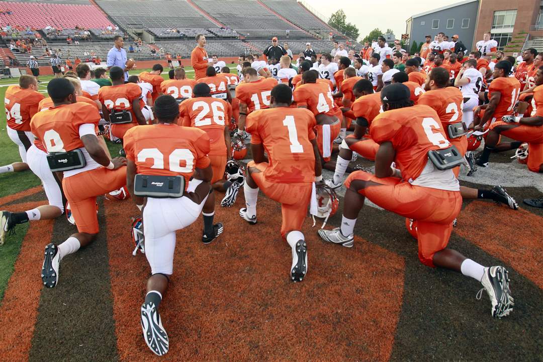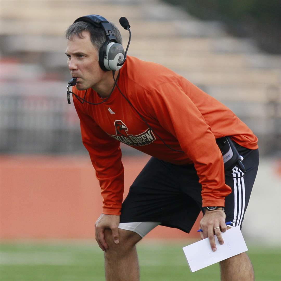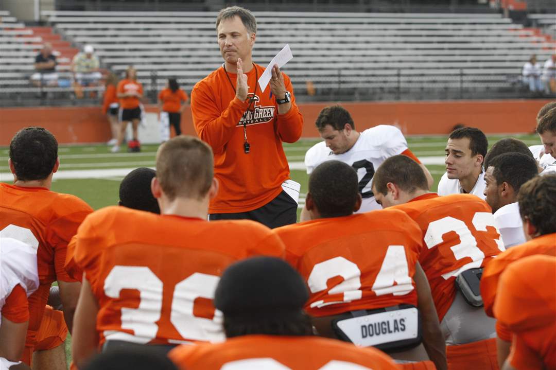 Head coach Dave Clawson talks to his team before the Bowling Green State University football scrimmage Thursday, 08/18/11, at Doyt Perry Stadium in Bowling Green, Ohio.
