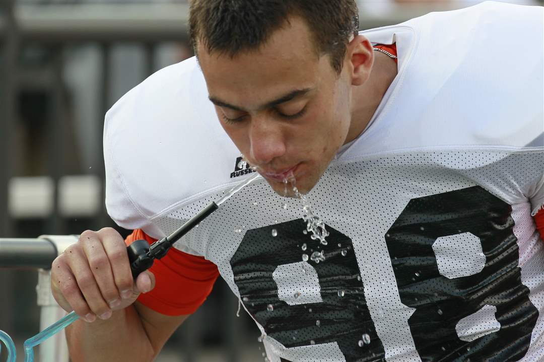 Tyler Tate (98) takes a drink before the scrimmage. After the game, coach Clawson was confident the Falcons would have a good season.
