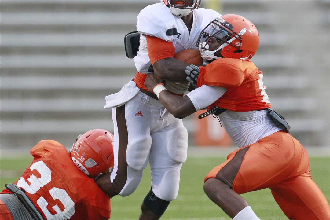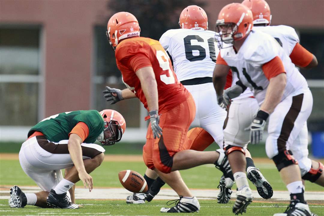 Quarterback Trent Hurley fumbles the ball. The game was sloppy compared to BG's first scrimmage, but coach Clawson said he wasn't worried.