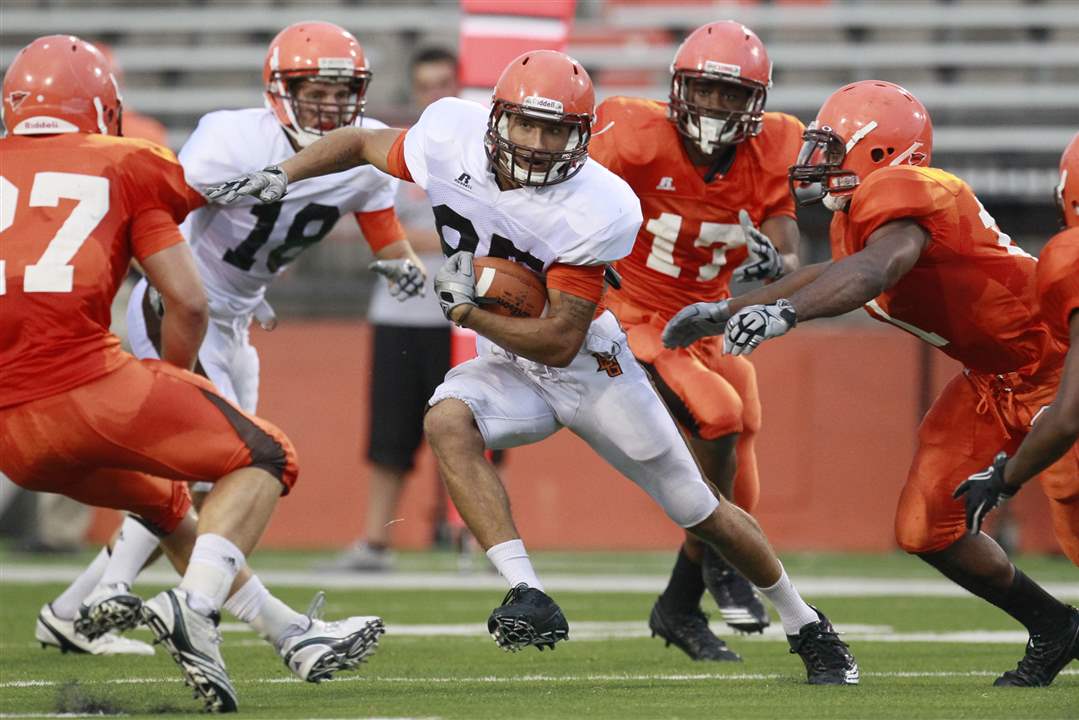 Wide receiver Shaun Joplin (83) sweeps through defenders. After an initial score for the BG offense, the defense generally had the better of play.