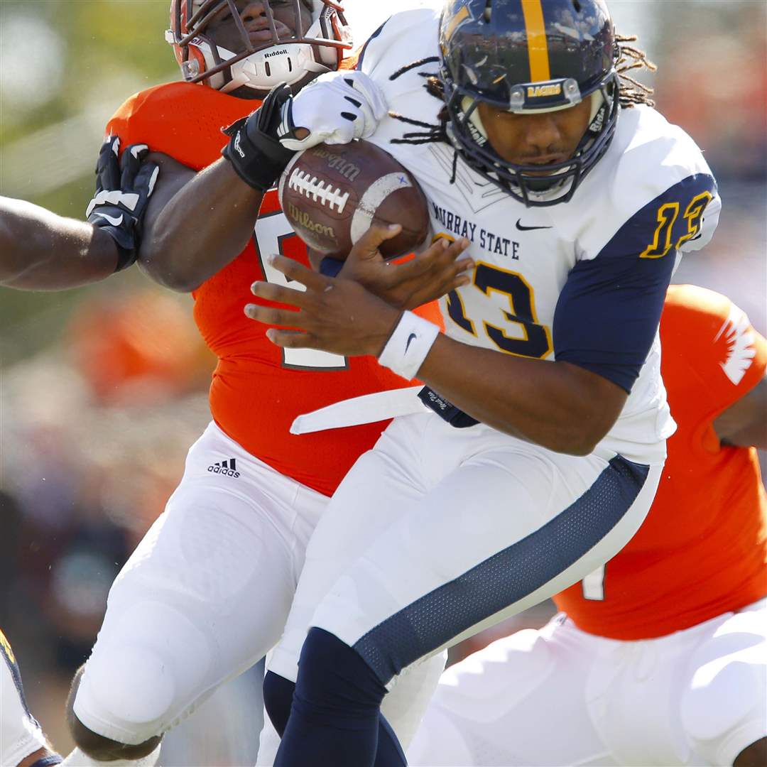 Bowling Green State University player Taylor Royster (51) sacks Murray State quarterback Maikhail Miller (13) during the first quarter.