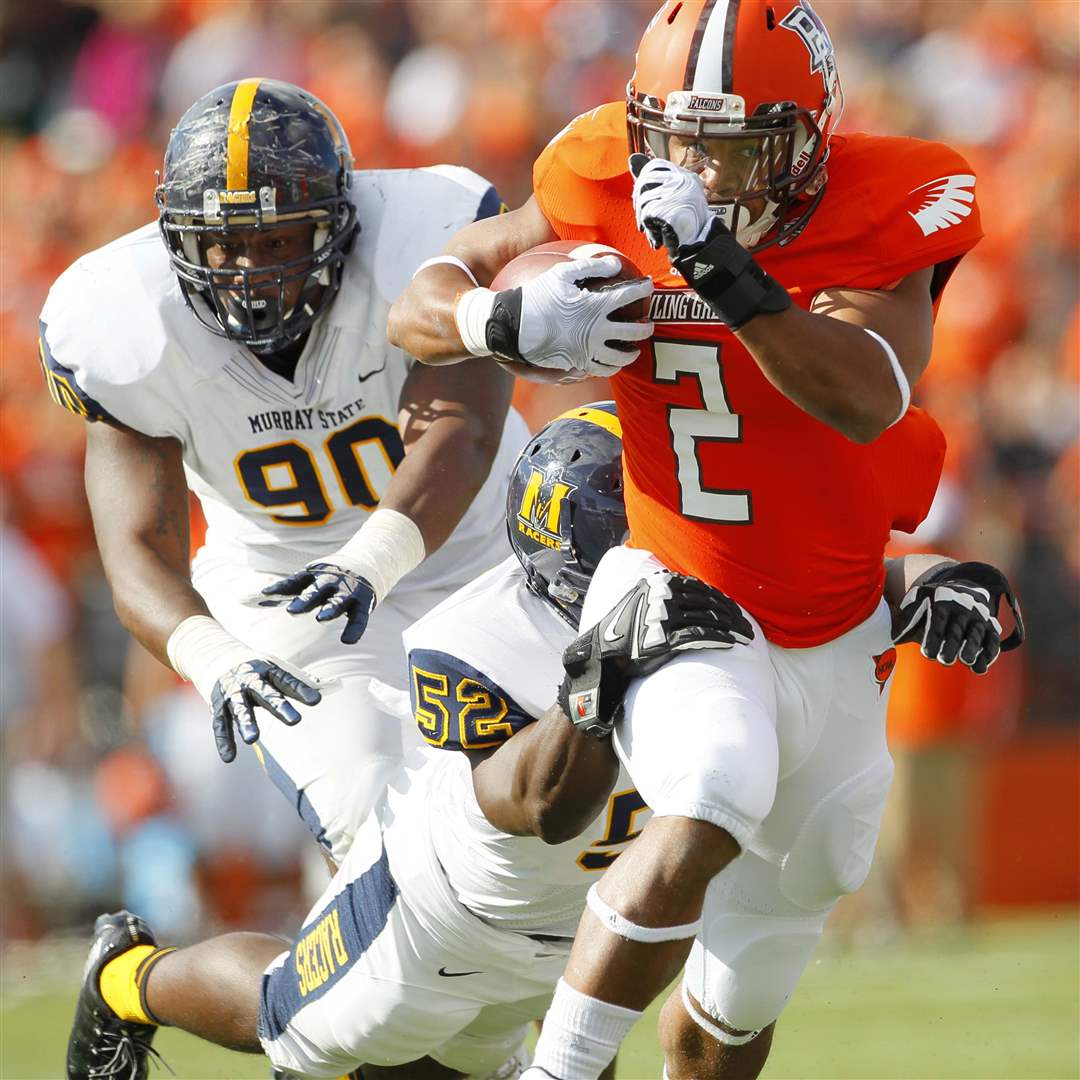 Bowling Green State University player Andre Givens (2) breaks free from Murray State players Demetrius Mason (90) and Sam Small (52) during the second quarter.