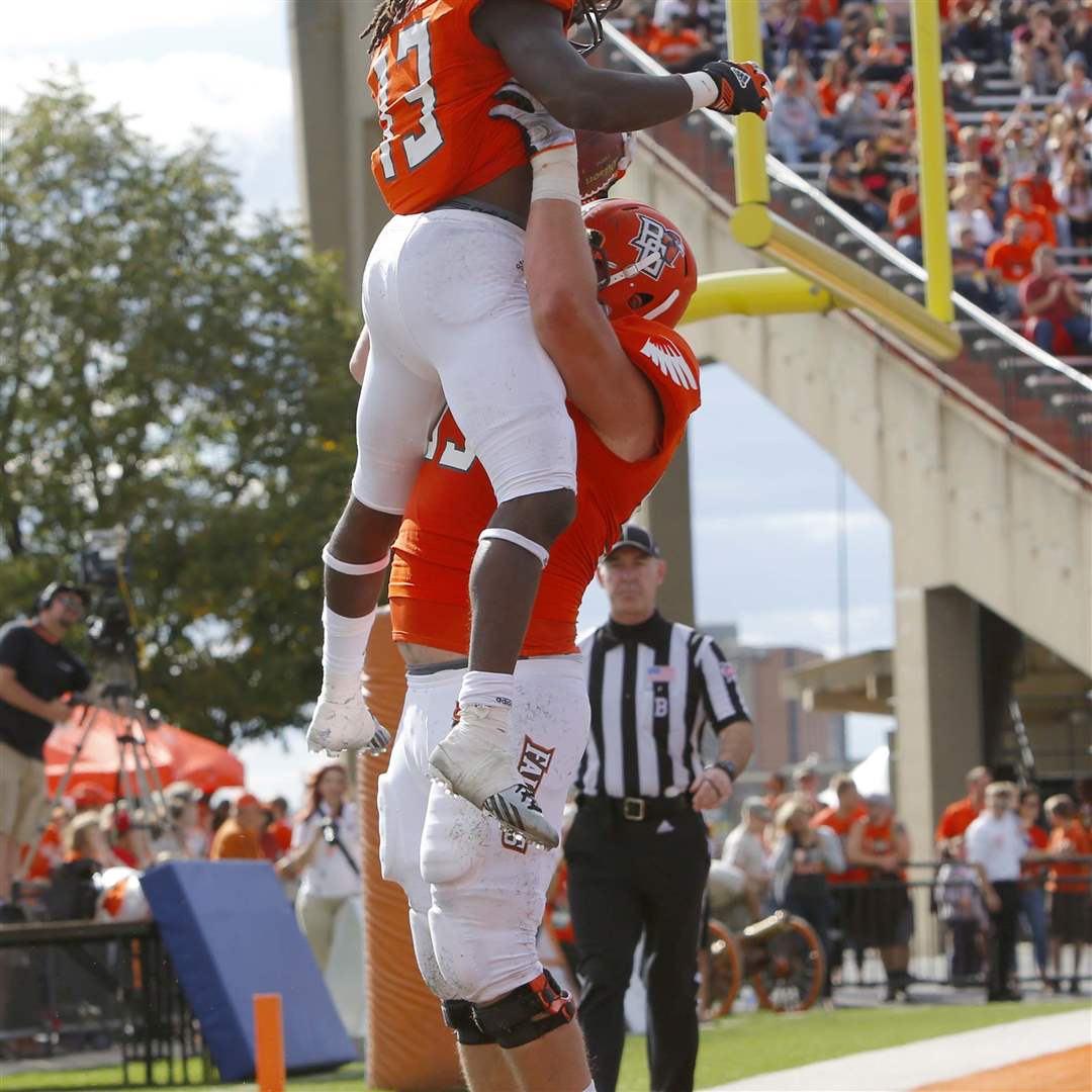 Bowling Green State University player Travis Greene (13) is hoisted in the air by teammate Alex Huettel (55) after scoring a touchdown.