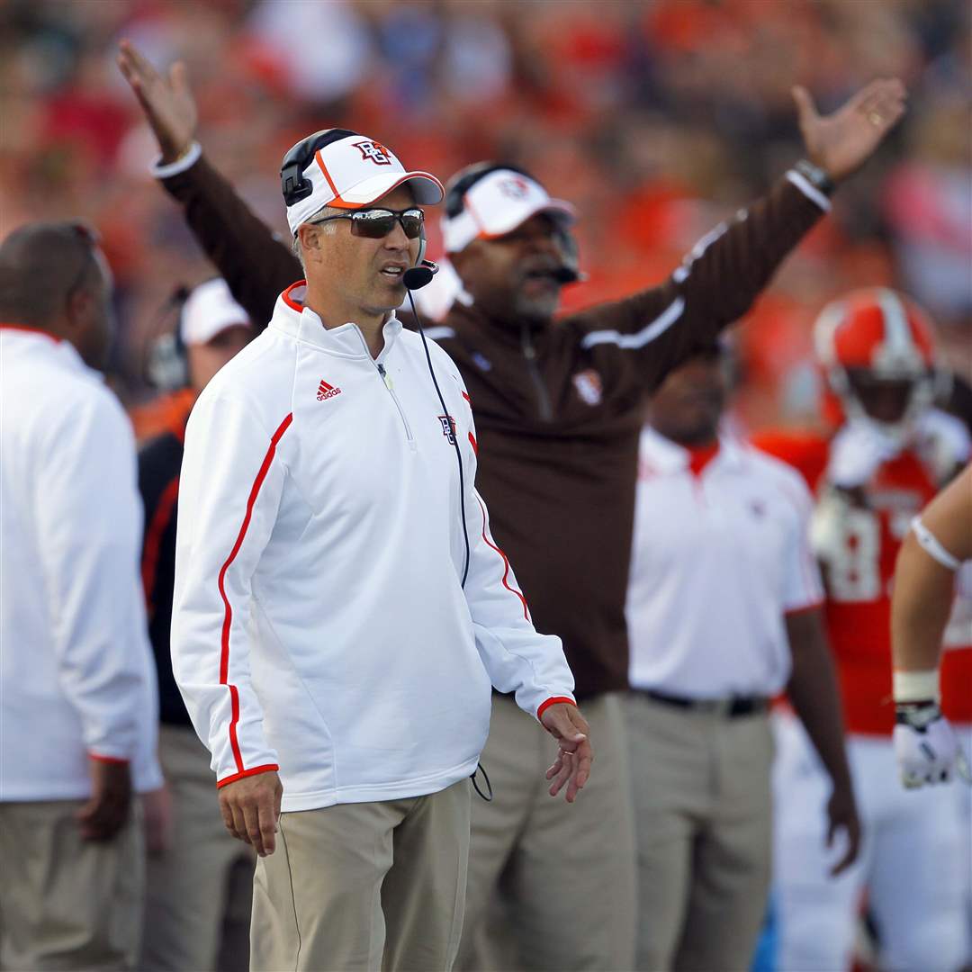 Bowling Green head coach Dave Clawson looks to the officials as a penalty is called against Murray State for a late hit on quarter back Matt Johnson (11) during the second quarter.