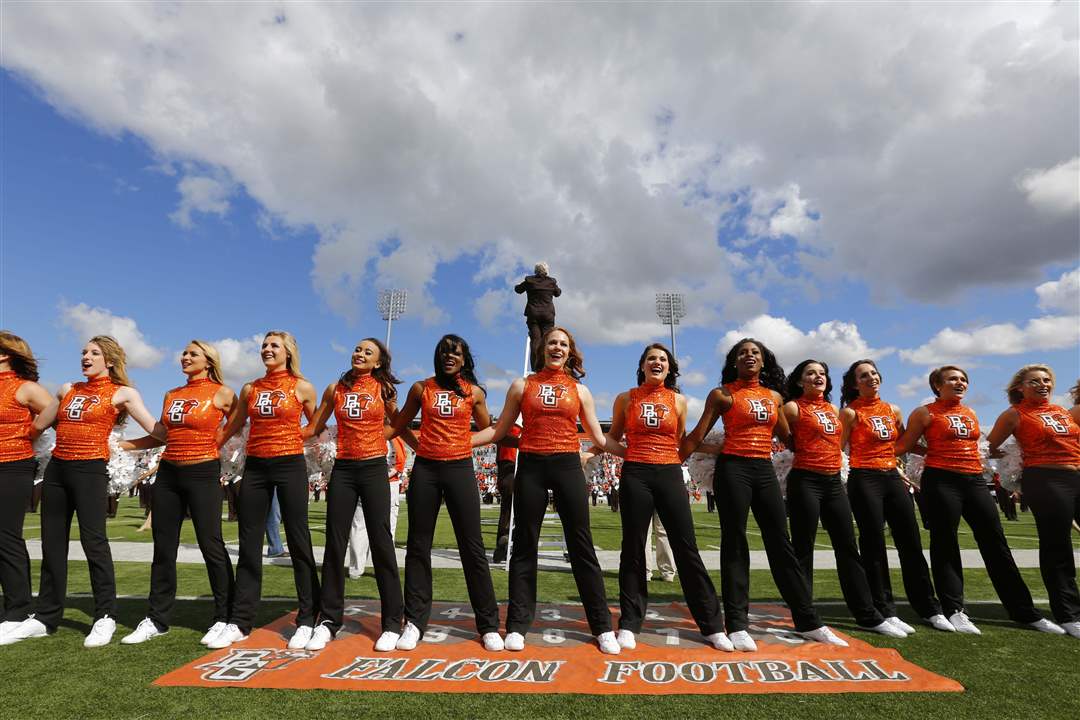 Bowling Green State University dance team members sing the alma mater before the Falcon football team plays Murray State.