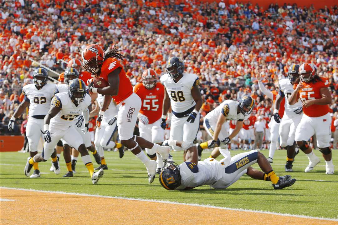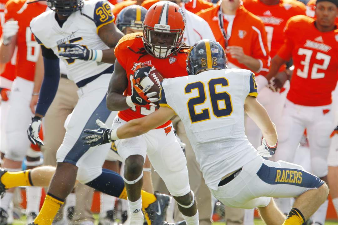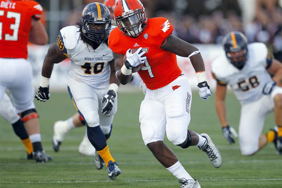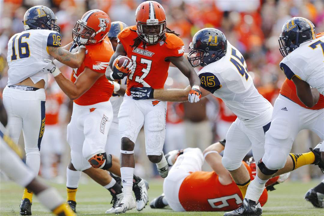 Bowling Green State University player Travis Greene (13) skips away from Murray State player Chavez Sims (7) for a touchdown during the second quarter.