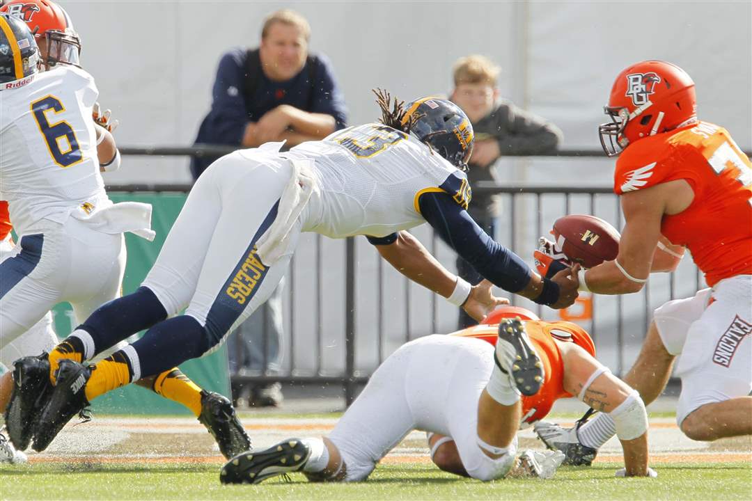 Murray State quarterback Maikhail Miller (13) fumbles the ball into the hands of Bowling Green State University player Paul Swan (33) at the goal line during the first quarter.