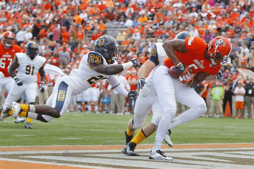 Bowling Green State University player Ronnie Moore (5) hauls in a pass for a touchdown beating Murray State players Darrian Skinner (23) and Perry Cooper (45) during the first quarter.