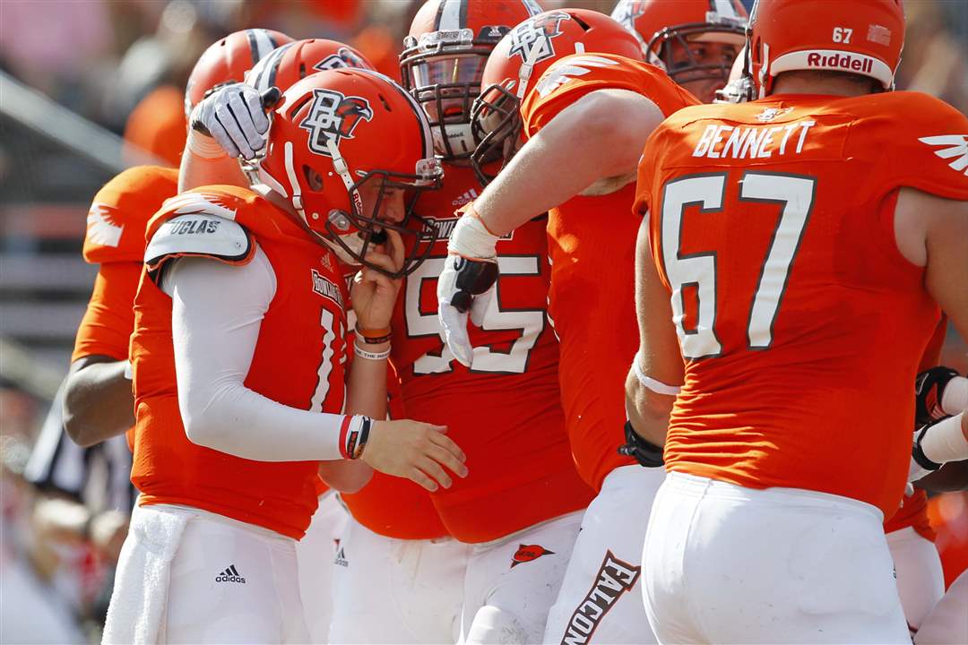 Bowling Green State University quarterback Matt Johnson (11) celebrates with teammates after scoring a touchdown during the second quarter.