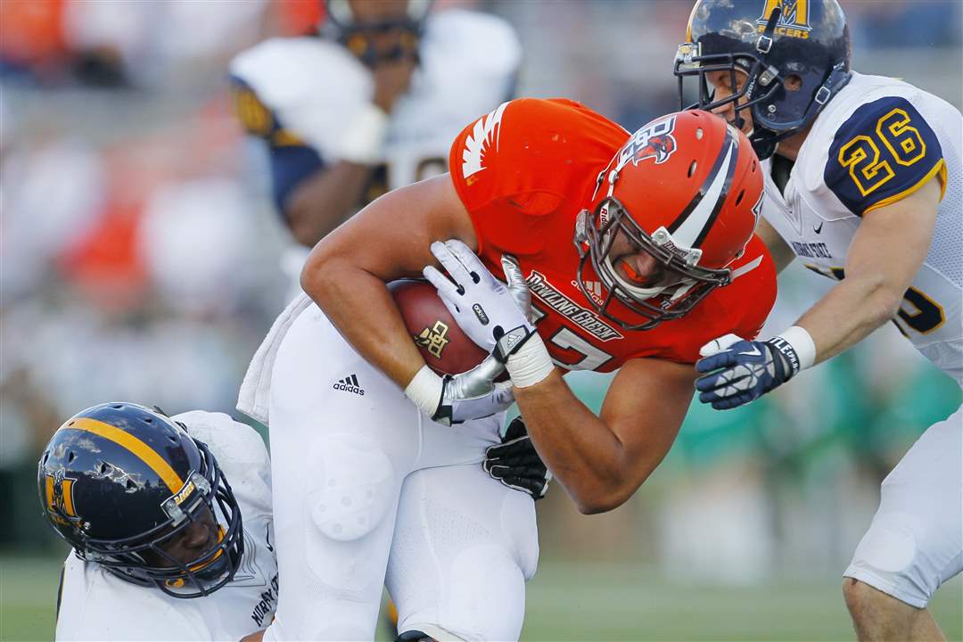 Bowling Green player Kevin Collins (82) is tackled by Murray State players Sam Small (52) and Demetric Johnson (26) during the second quarter.