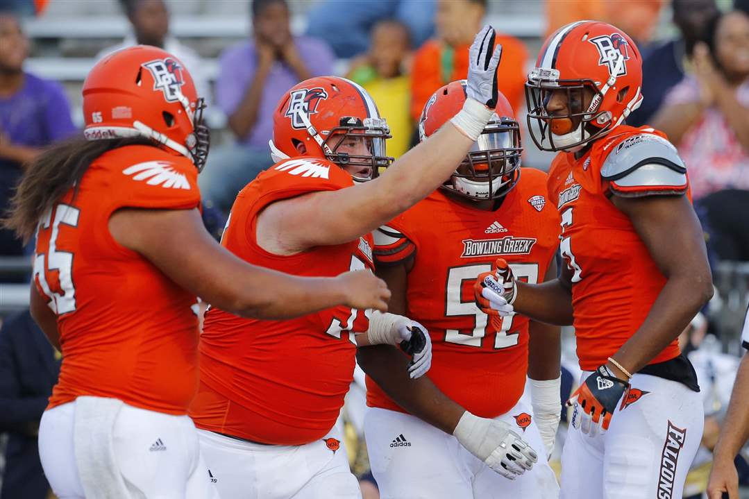 Bowling Green player Shaun Joplin (9) right, celebrates with teammates after scoring a touchdown during the second quarter.