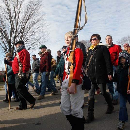 About 300 re-enactors march from the Sawyer Homestead to the River Raisin National Battlefield Park Visitor Center.