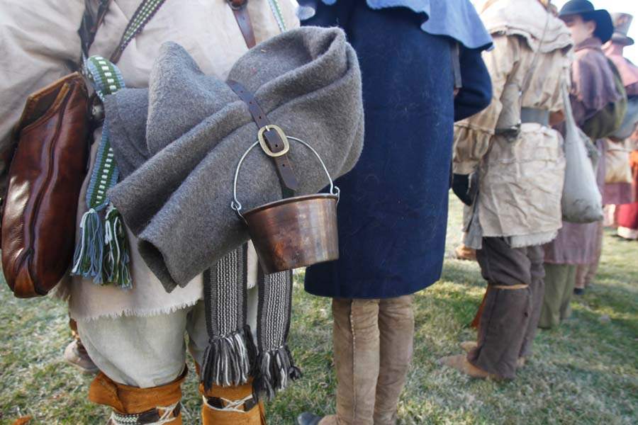 A soldier from 2nd Kentucky volunteers carries a bucket as part of his war gear.