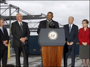 Mr. Biden speaks to the crowd while touring CSX in North Baltimore. Behind from left: Wilby Whitt, CSX Intermodal Terminals Inc. president, Secretary of Transportation Anthony Foxx, Mr. Oscar Munoz, Chief Operating Officer and Executive Vice President of CSX Corporation, and Representative Marcy Kaptur (D - OH).