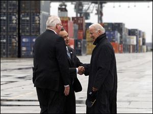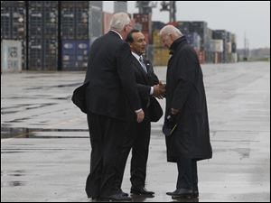 Vice President Joe Biden, right, is greeted by Mr. Oscar Munoz, Chief Operating Officer and Executive Vice President of CSX Corporation, center, and Wilby Whitt, CSX Intermodal Terminals Inc. president, right.