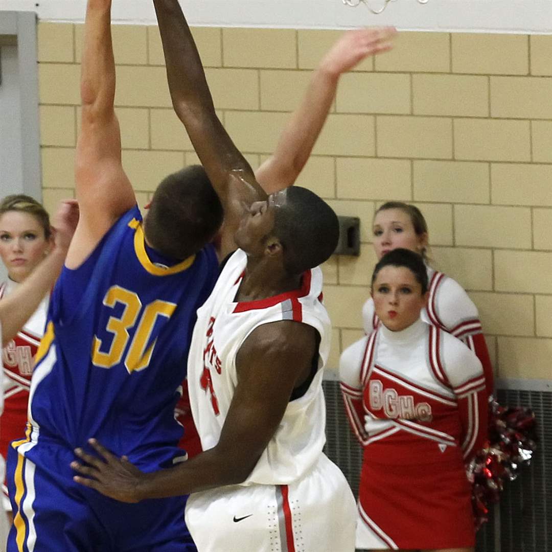 BG's Vitto Brown towers over Findlay's Grant Niswander as he tips in a teammate's missed shot.