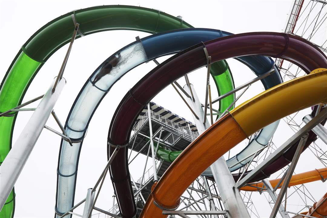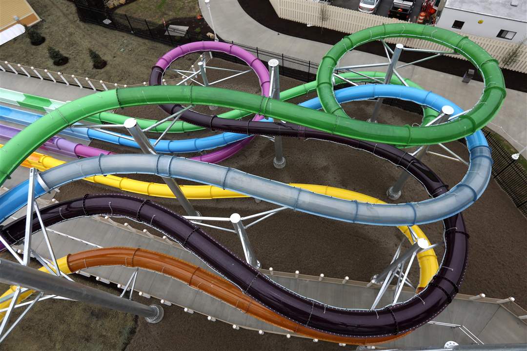 The water tubes for new attraction Point Plummet are pictured Thursday at Cedar Point Shores Waterpark in Sandusky. Point Plummet features a six-story-high water body slide.