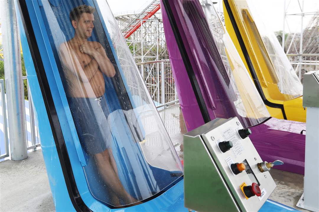 CTY Cedar26p A rider flies down the blue tube at the new attraction Point Plummet Thursday, May 25, 2017, at the newly renamed Cedar Point Shores Waterpark in Sandusky. The waterpark has 17 attractions in total, including two new rides and two new children's areas. Point Plummet features a six-story-high water body slide. THE BLADE/KATIE RAUSCH