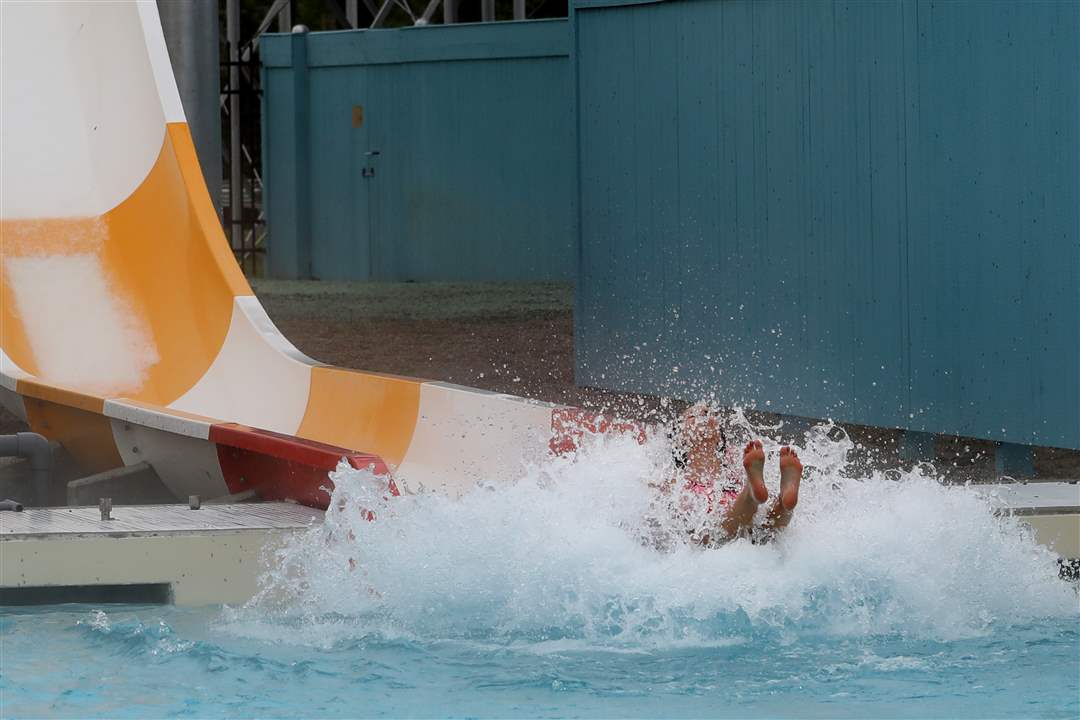 WTOL's Allie Hausfeld crashes into the landing pool as she rides the new attraction Portside Plunge at the newly renamed Cedar Point Shores Waterpark in Sandusky.