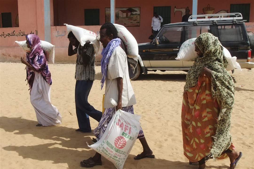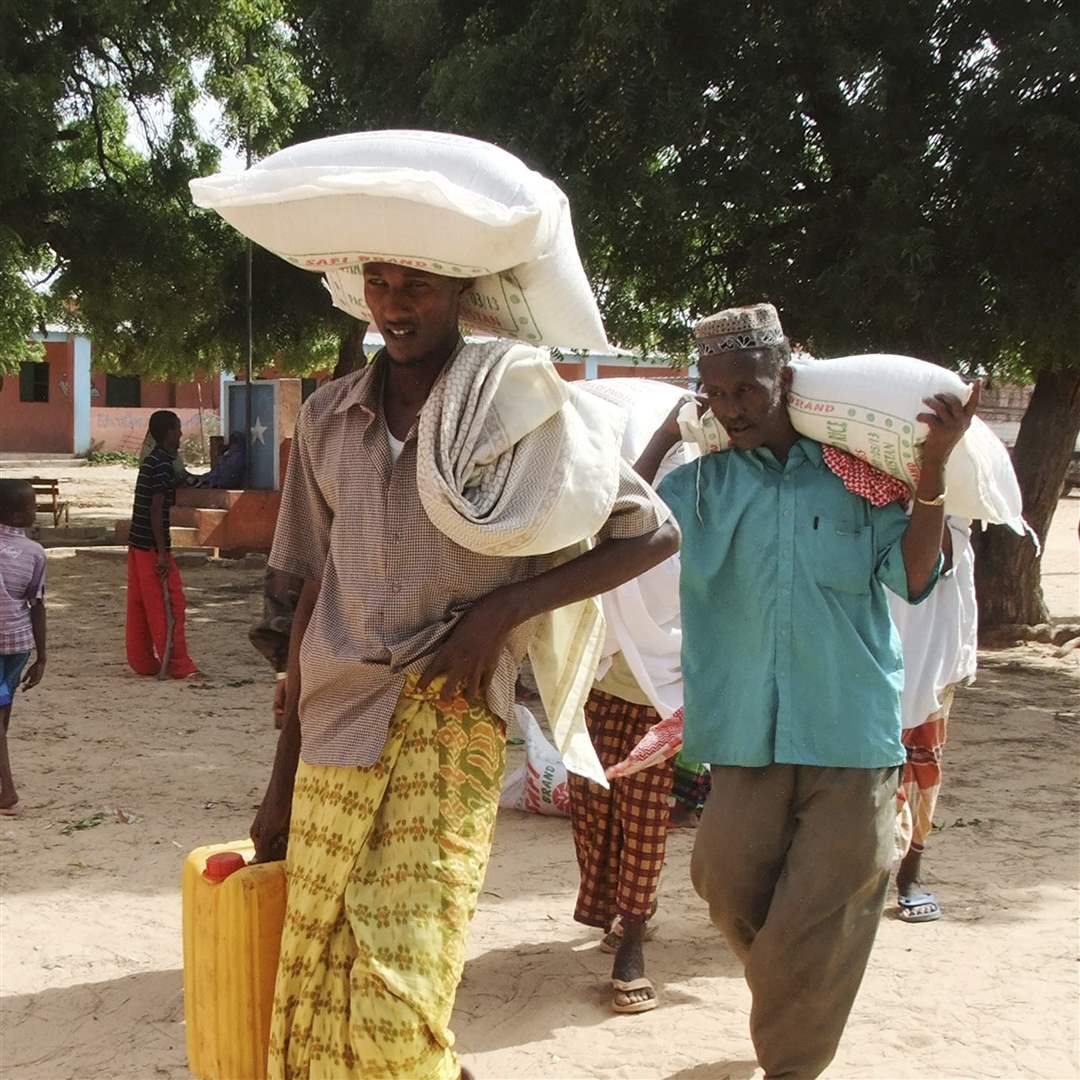 Men from southern Somalia carry food rations received at a displaced camp in Mogadishu, Somalia.