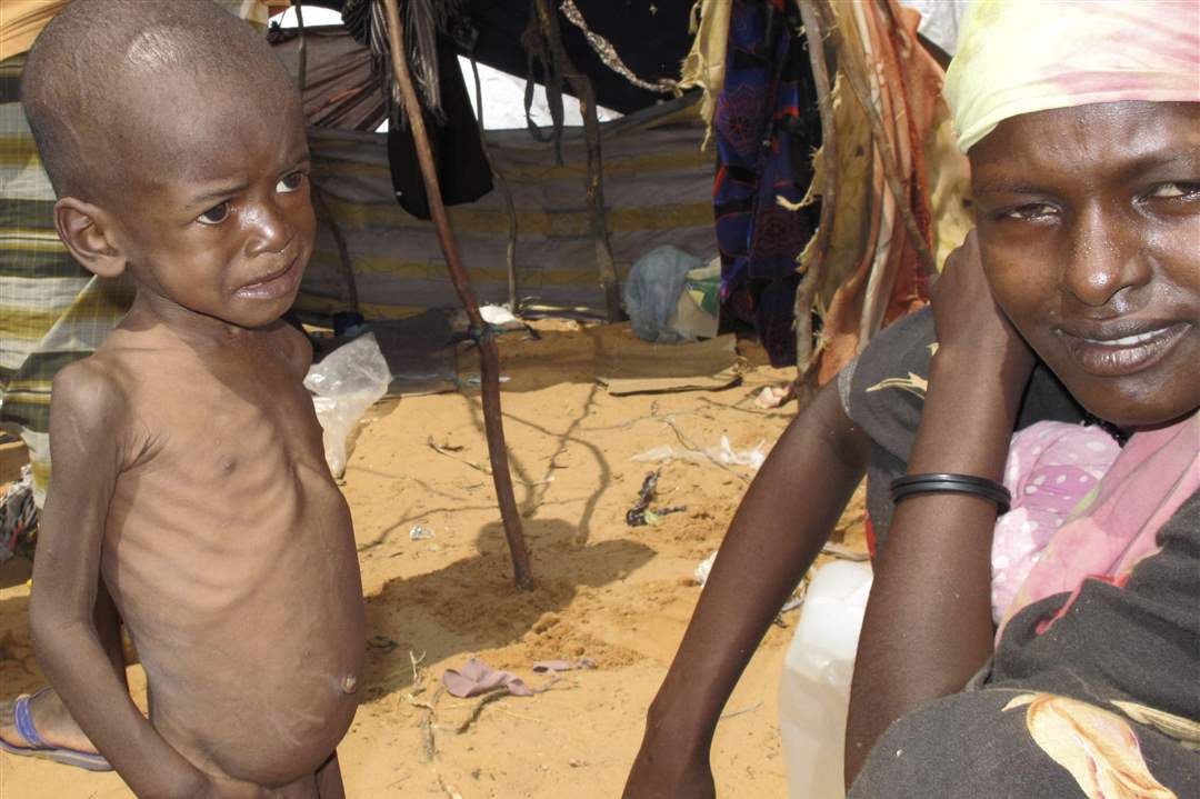 A Somali woman looks away from the pleading of a malnourished child in front of their makeshift shelter in Mogadishu, Somalia.