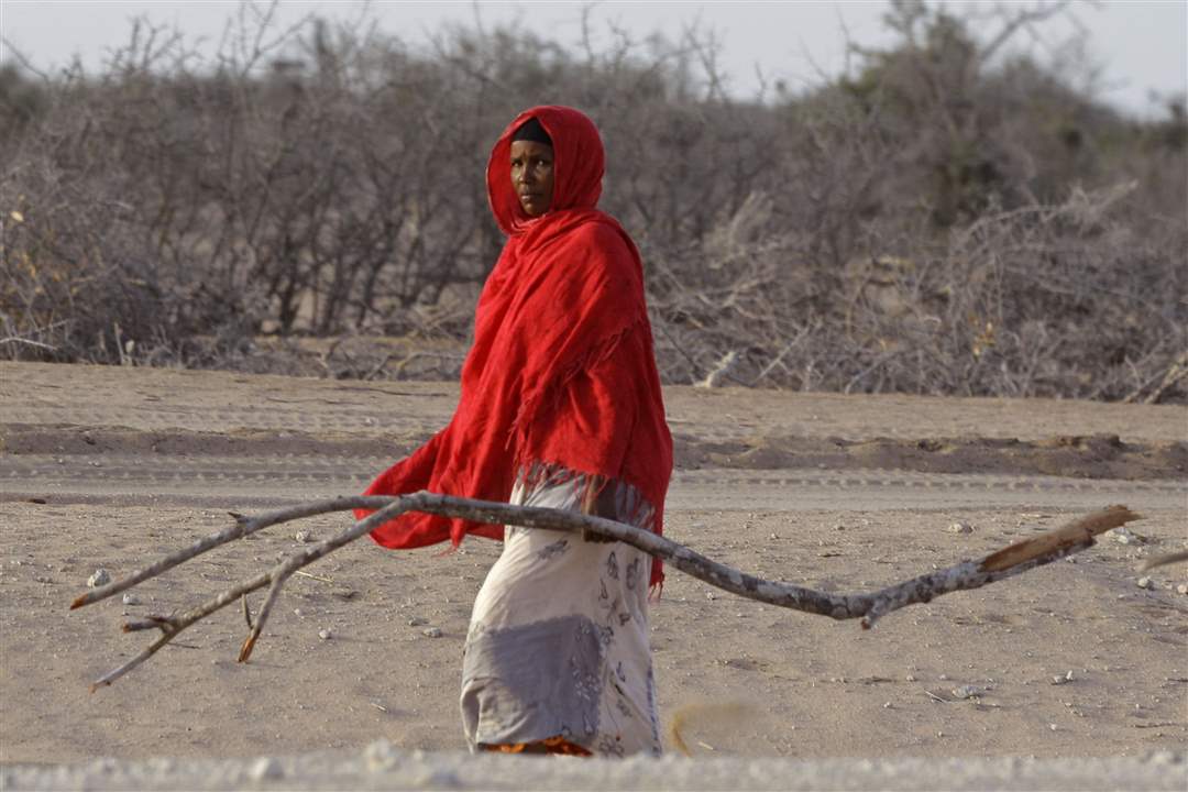 A woman carries wood for a fire near the border town of Dadaab, Kenya.