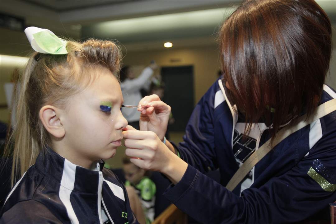 Kayla Knight, 9, of Toledo is readied for performing by a fellow member of the Ohio Elite All Stars, Megan Richardville, 17, of Walbridge. The team is from Milbury.
